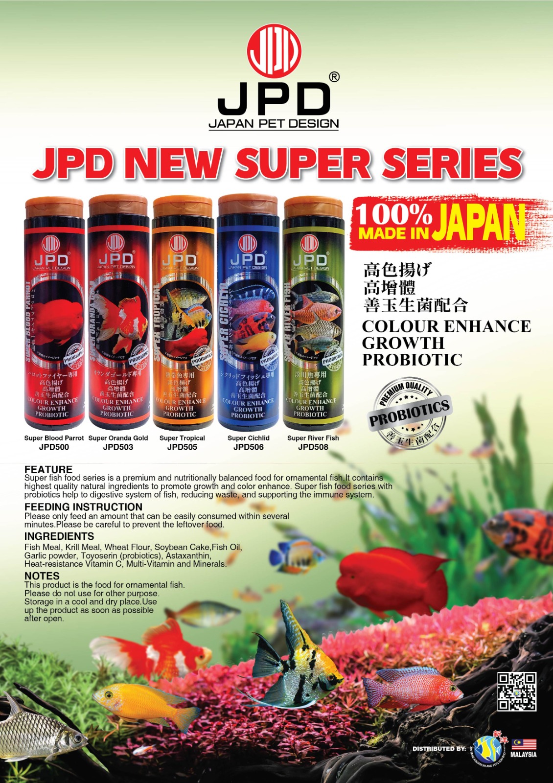 - JPD Super Fish Food Series with probiotics help to digestive system of fish, reducing waste, and supporting the immune system.