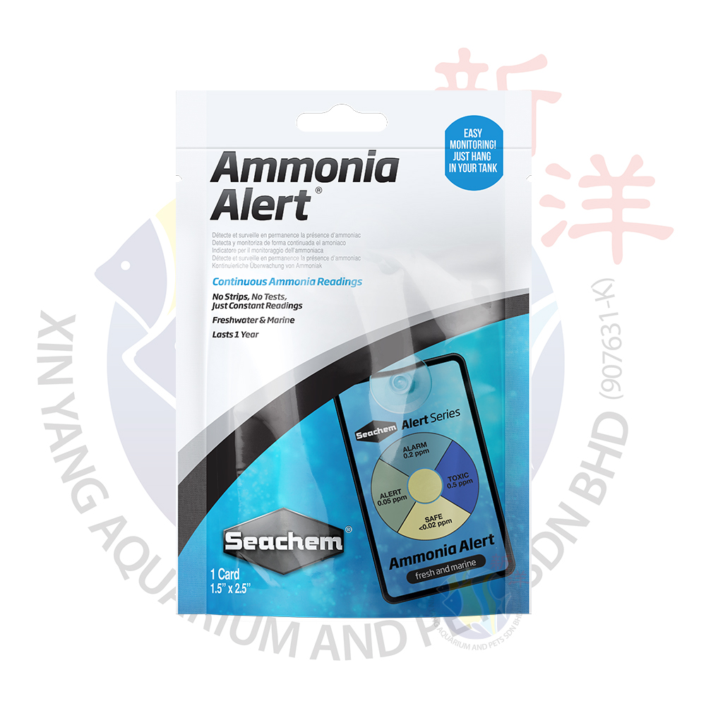 Ammonia Alert® is an innovative color device for continuously detecting and monitoring toxic free ammonia. A sensor changes reversibly from yellow to green to blue, relative to the ammonia concentration. No test kits, chemicals, or procedures are needed. The device detects less than 0.05 mg/L (ppm) free ammonia and alerts you to the #1 killer before any sign of stress. It lasts over a year. This product is not recommended for use at acid pH. Marine or freshwater use.